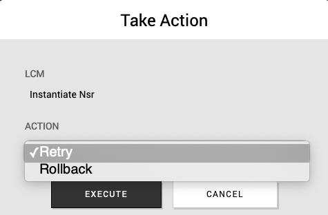 Choose retry to attempt instantiation again or choose rollback to rollback the operation. Click EXECUTE. If you attempt to rollback the operation, then all the elements that were allocated during the failed instance are released. This is similar to terminating the NS.