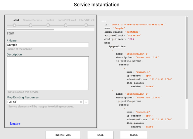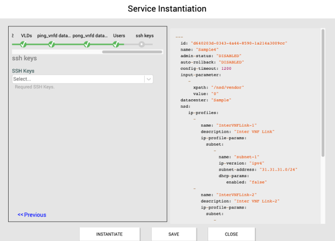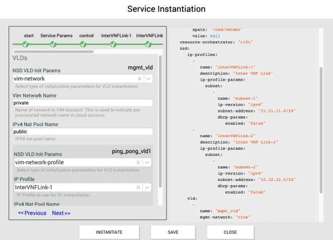 The NS instantiation process is customized for the NSD from which the service was created. Therefore, if the NSD has xpath Variables or Instantiation Variables, then the process is slightly different. You can refer to the steps for these processes. The remaining steps in this section are specific to the ping_pong_nsd.
