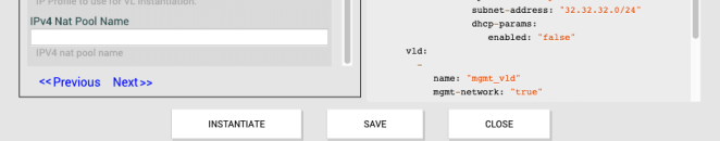 In this specific workflow, the NSD defines two VLDs mgmt_vld and ping_pong_vld1. The specific vlds for this NSD fully describe NSD VLD Init Params, VIM Network Name, VIM-network-profile and Ipv4 Nat Pool Name. This NSD has some default information so the UI preselected the InitParam option vim-network for mgmt_vld and vim-network-profile for ping_pong_vld1.