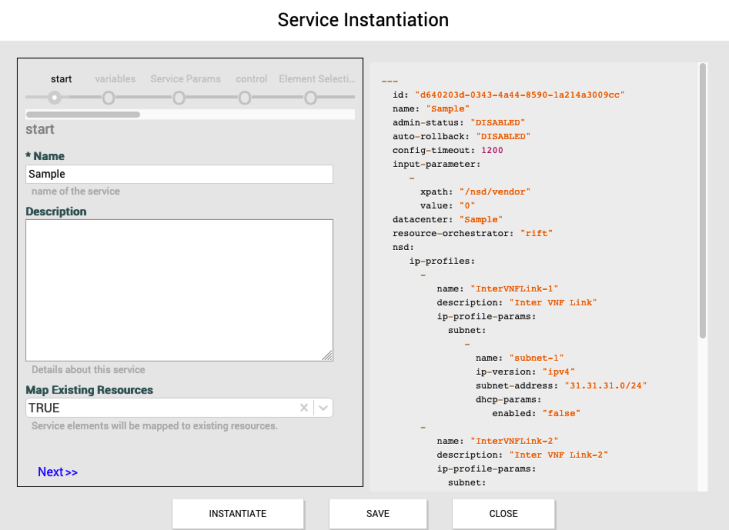If there are instantiation variables defined in the NSD from which this service was created, then you’ll see different options while instantiating the service. In this workflow, the Variables step appears. Please see the Variables step in the Instantiating a Service with xpath Variables Section.