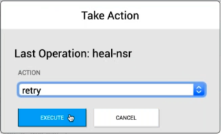 If the first heal attempt fails, then an operator can try to restart the VM again. This action can only be taken when the NSR is in the Failed state. A retry can also be made when scale instance state is in the failed-temp state. When a user attempts to retry the heal, the status in the UI shows the VNF-Heal progress. RIFT.ware processes a Heal on each VDU. The heal options are restart and no operation.
