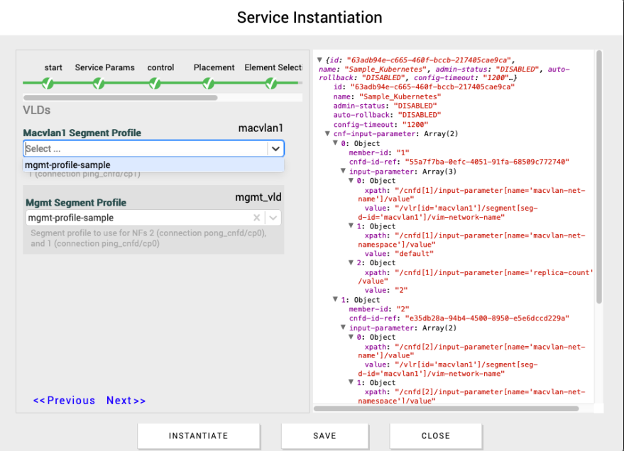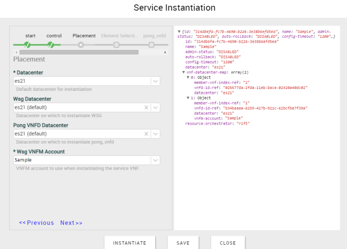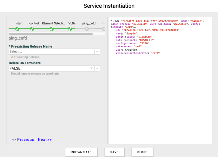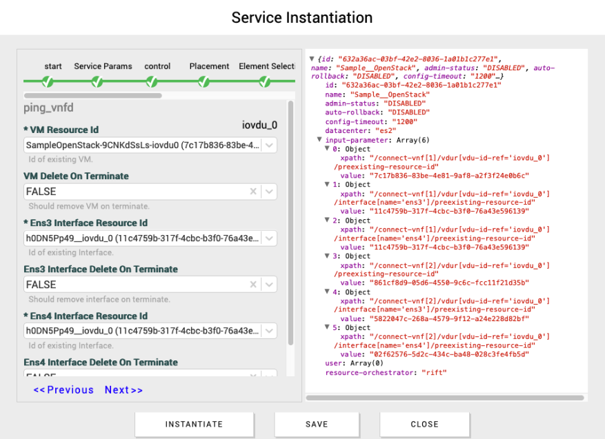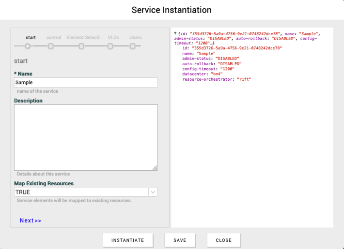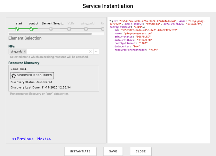 The steps to instantiate a service that will use existing resources mapped to elements defined in the service are customized for your NSD. The Network Service Instantiation section includes more information on designing and editing specific variables in an NS prior to instantiation. Two of the steps specific to this process are Element Selection and Preexisting VLDs.