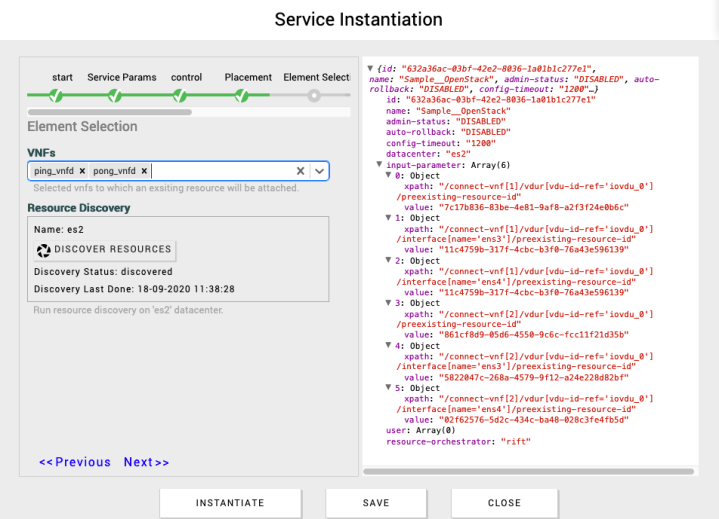 The steps to instantiate a service that will use existing resources mapped to elements defined in the service are customized for your NSD. The Network Service Instantiation section includes more information on designing and editing specific variables in an NS prior to instantiation. The required steps are to discover resources and then select the NFs to which an existing resource will be attached. Once the NF is select, then the NF will appear in the Service Instantiation Wizard.