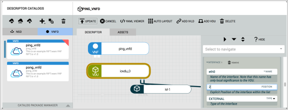 Select the VNFD you want to modify, click the VDU object in the canvas, and edit the following fields in the Editor pane under Interface.